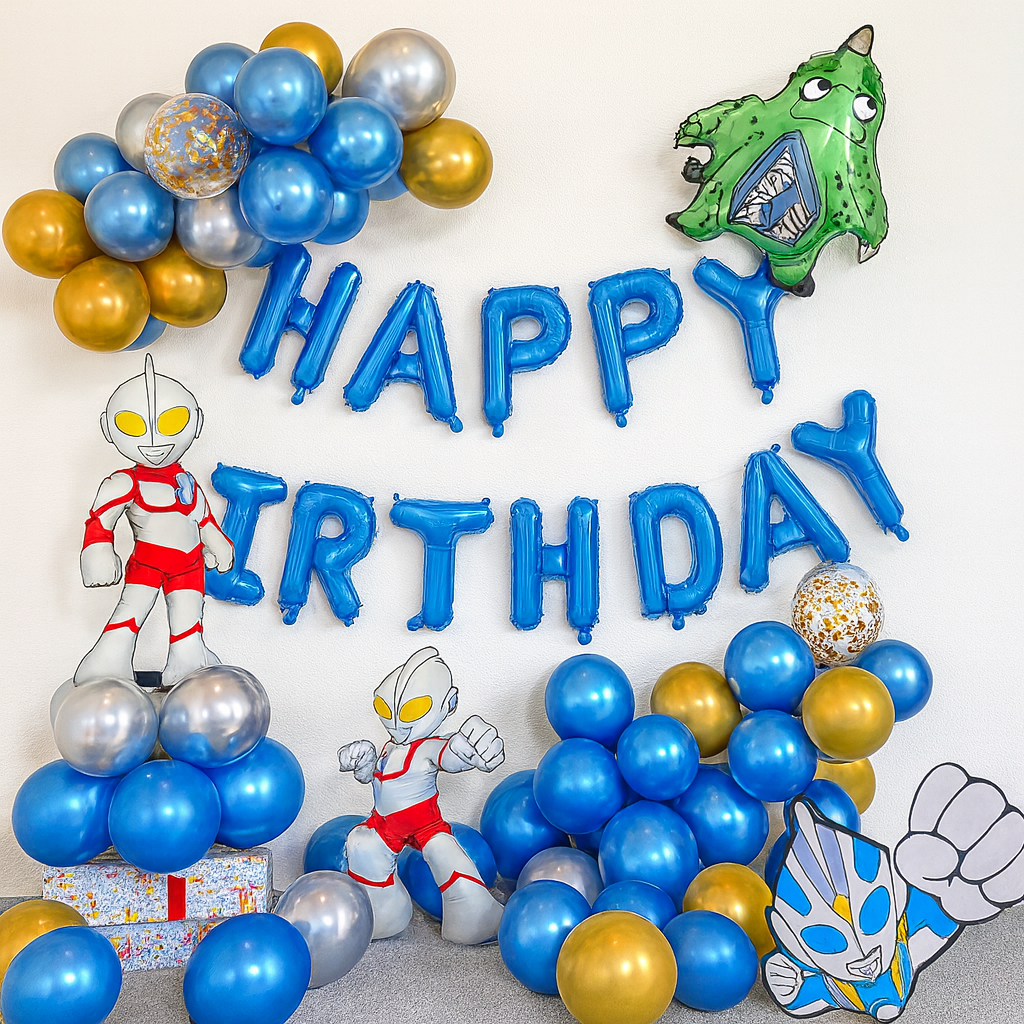 Make your child’s birthday extra special with this fun Ultraman-themed birthday decoration set! Featuring a mix of blue, gold, and silver balloons with “Happy Birthday” foil letters and Ultraman character balloons, it’s perfect for superhero fans. Easy to set up and ideal for kids’ parties, photos, and festive backdrops.
