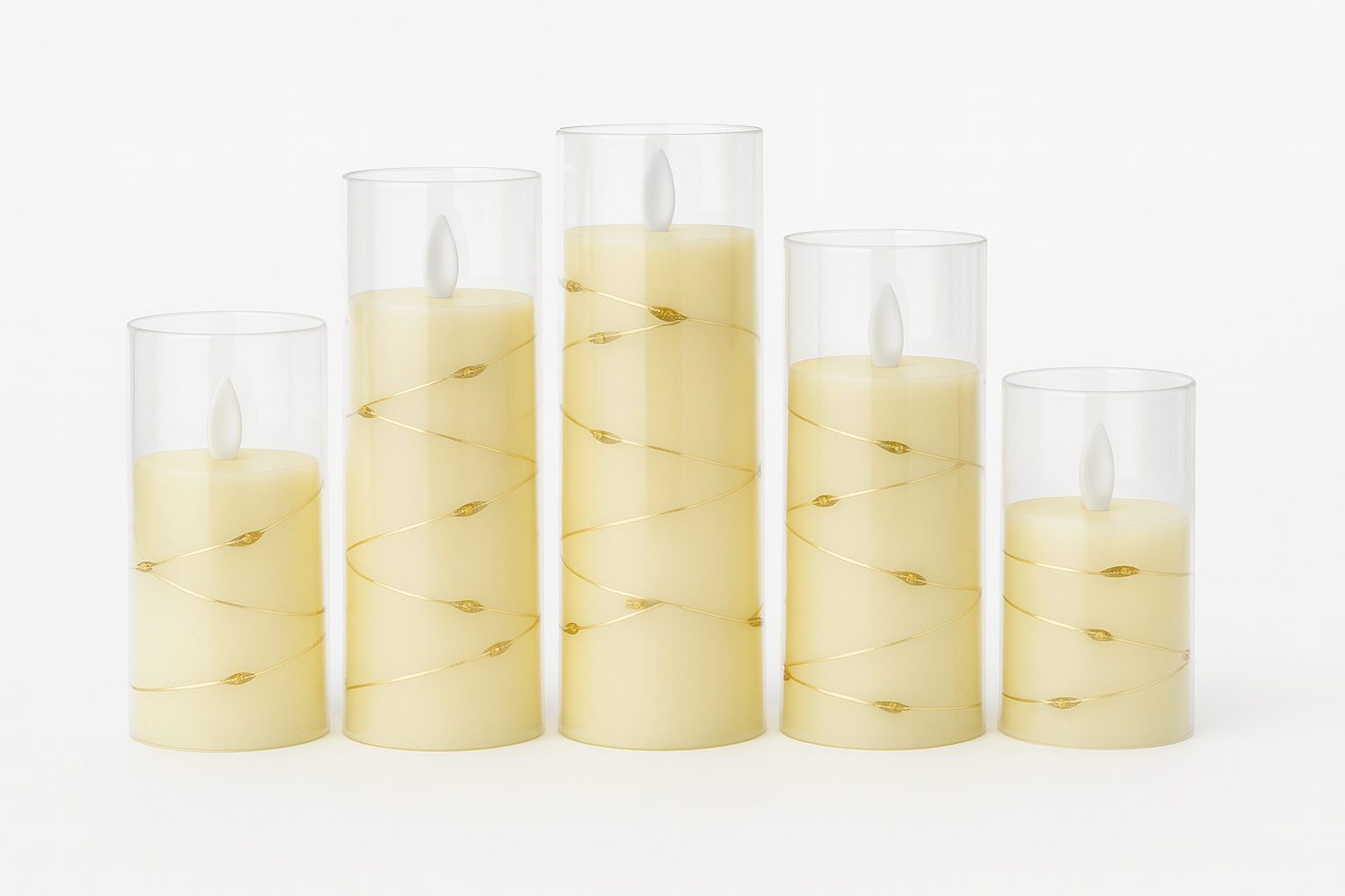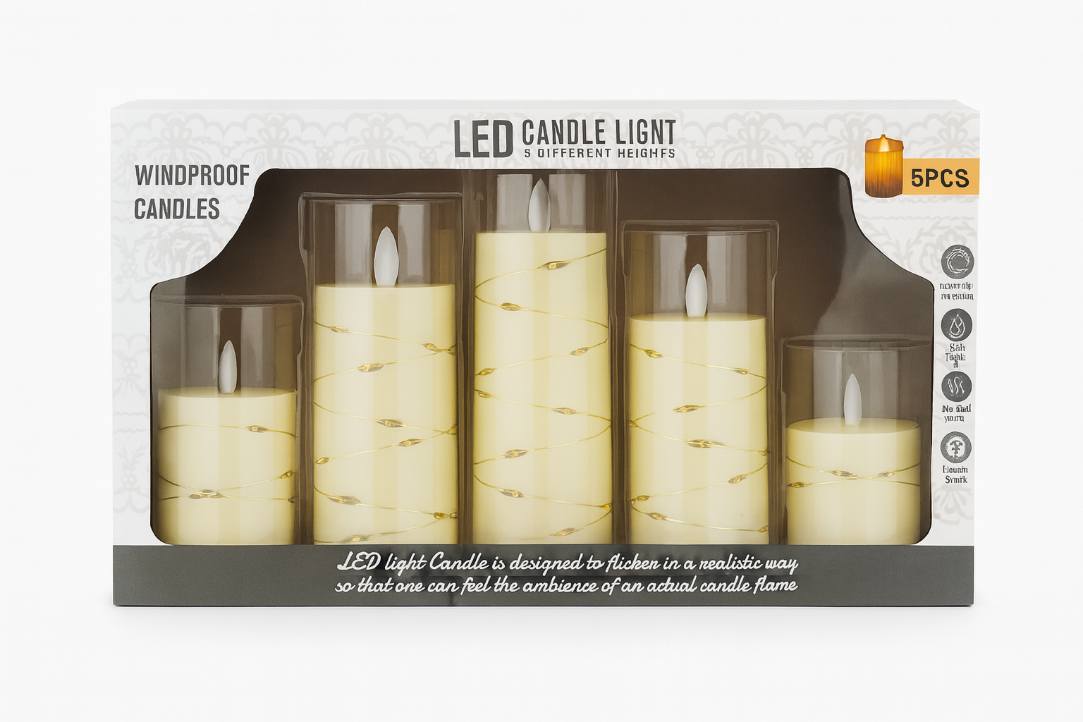 Bring the charm of real candlelight into any space with this elegant 5-piece LED candle set. Each pillar features a soft-warm yellow light flickering flame effect that recreates the ambience of a real candle without smoke, dripping wax, or fire risk.